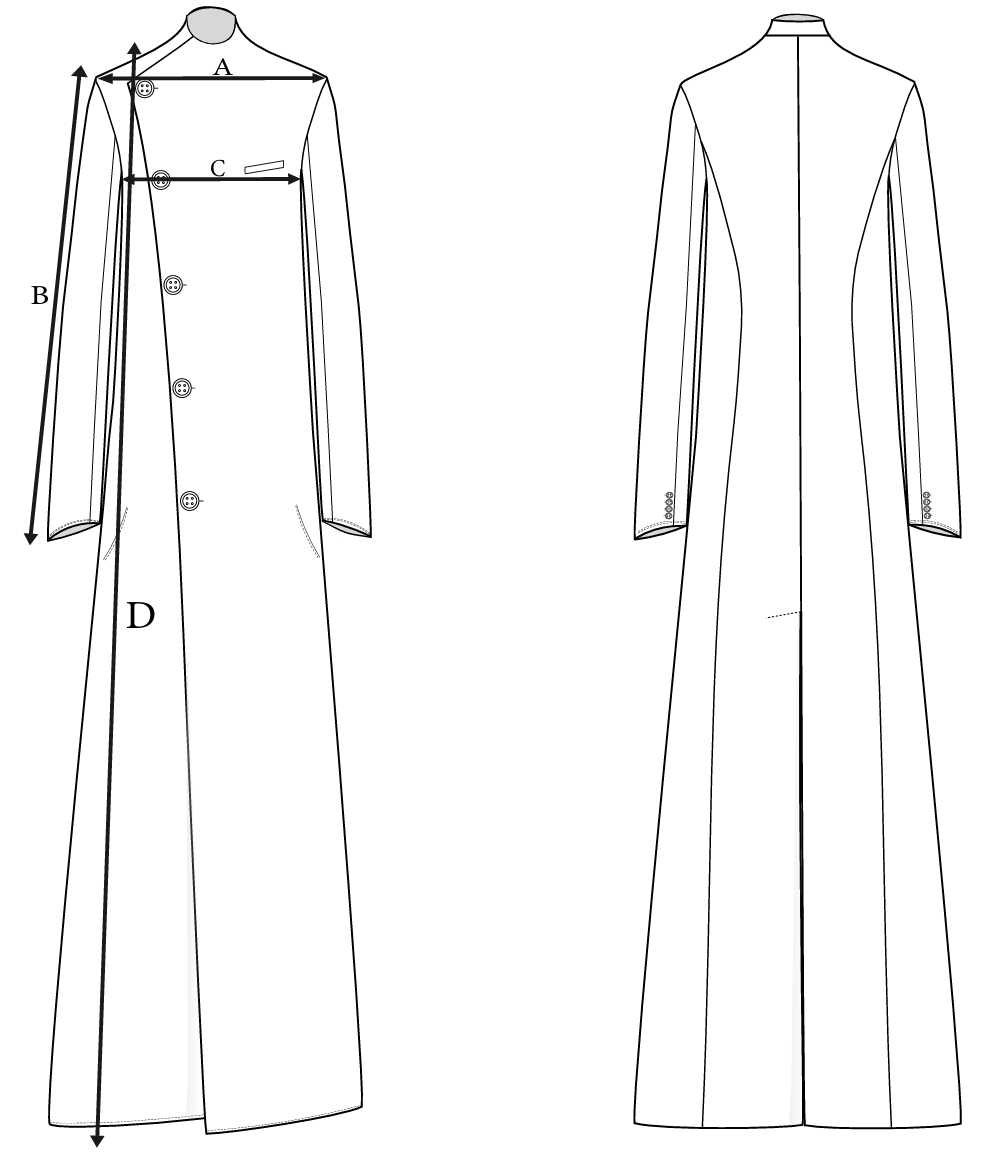 Пальто из итальянской вареной овечьей шерсти (лоден) застёгивается по косой до уровня плеча. Его можно застегивать разными способами, самостоятельно регулируя размер лацканов. Благодаря своей конструкции пальто имеет два слоя спереди, что делает его более устойчивым к различным температурным условиям.