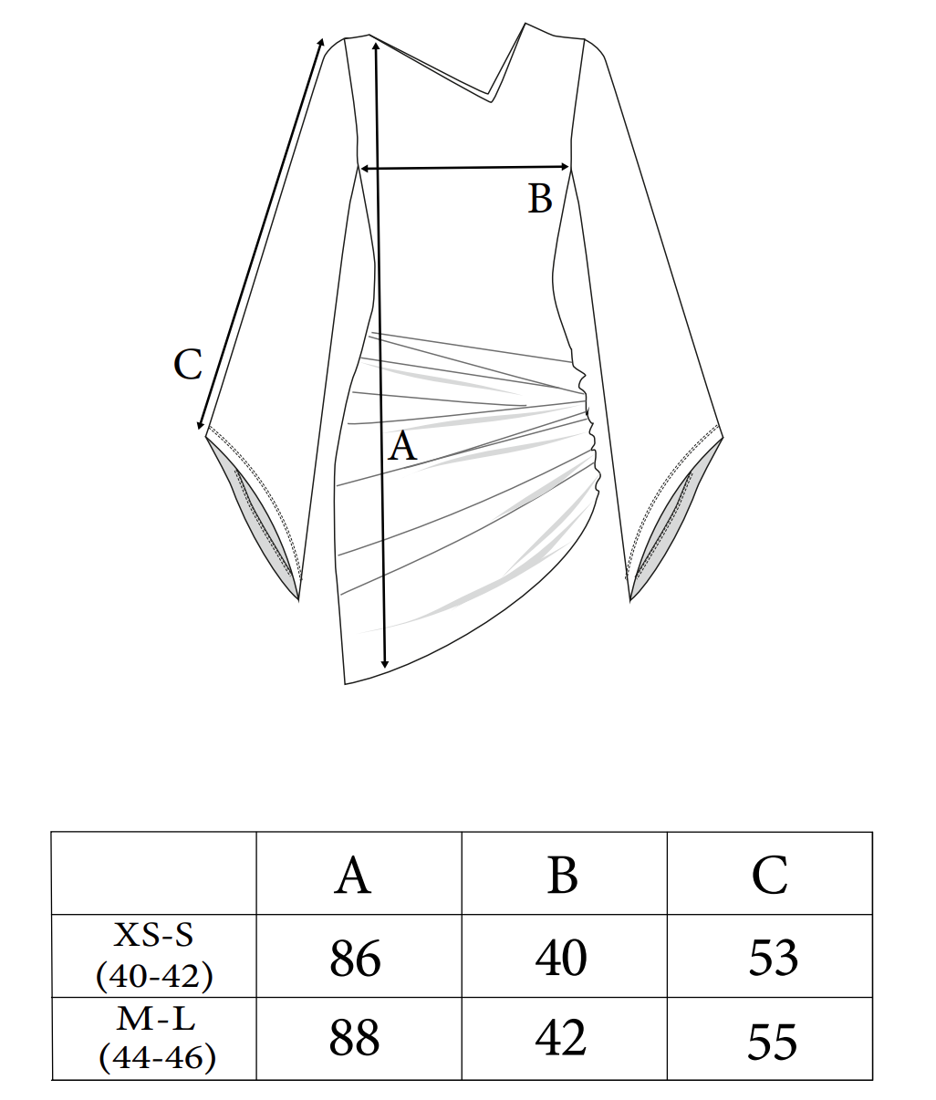 • Прилегающий силуэт и ассиметричный низ, ассиметричный вырез горловины сзади и спереди, низ рукава расклешенный и слегка укороченный.