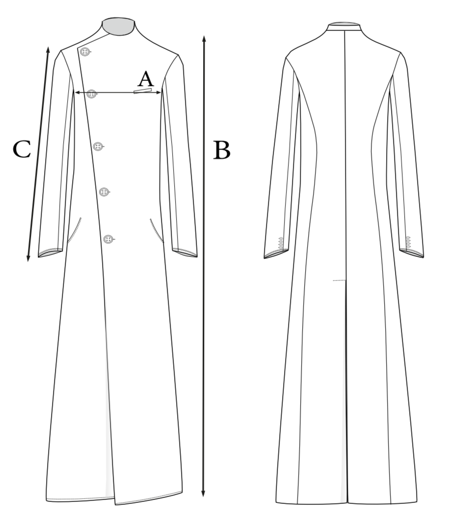 Пальто из итальянской вареной овечьей шерсти (лоден) застёгивается по косой до уровня плеча. Его можно застегивать разными способами, самостоятельно регулируя размер лацканов. Благодаря своей конструкции пальто имеет два слоя спереди, что делает его более устойчивым к различным температурным условиям.